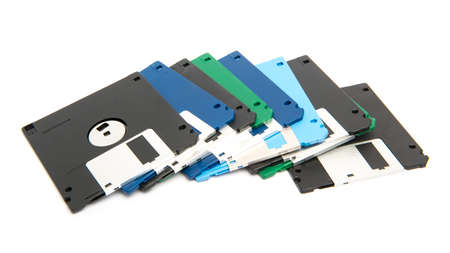 Whole plane with white background of stack of colored floppy disks, grey, black and blue.