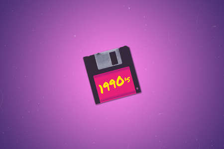 A retro synthwave 1990's themed old aged floppy disk illustration background with vibrant colors and copy space