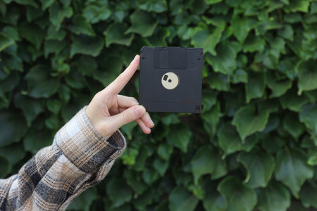 Floppy disk in hand on green leaves wall background
