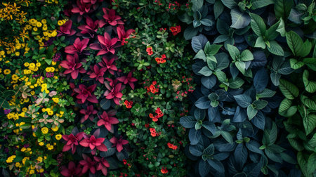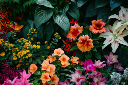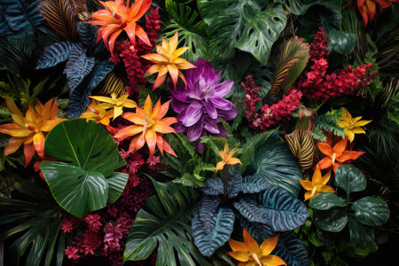an overhead shot of a vibrant, multi-colored tropical plant bed, created with generative ai