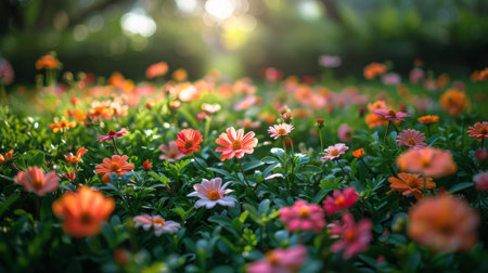 Beautiful colorful flowers in the garden with sunlight and bokeh