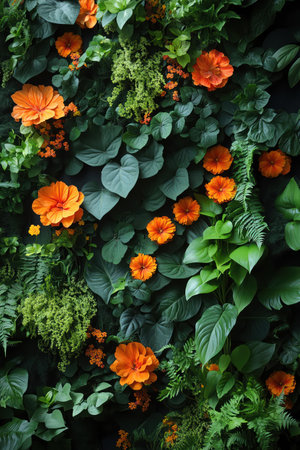 Vertical garden with lush green foliage and vibrant orange flowers, natural light, dense and thriving, vibrant indoor greenery