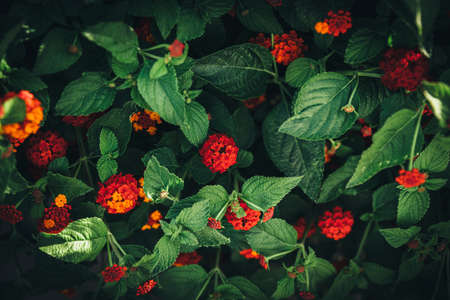 Juicy Red-orange Lantana flowers in green bush with sun flare