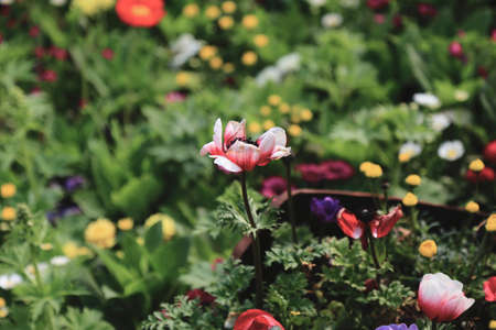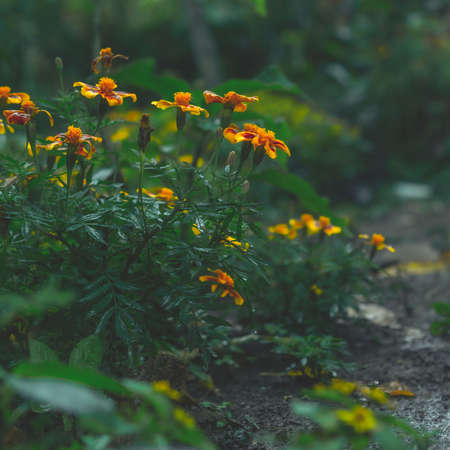 Selective focus flowers background. Amazing view of colorful flowering in the garden and green grass landscape at Winter day