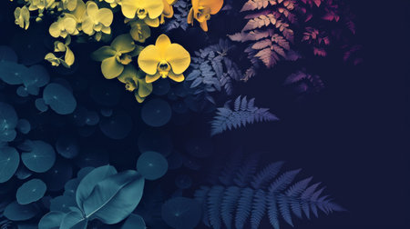 A striking visual composition featuring bright yellow orchids juxtaposed with dark red ferns against a deep blue background.
