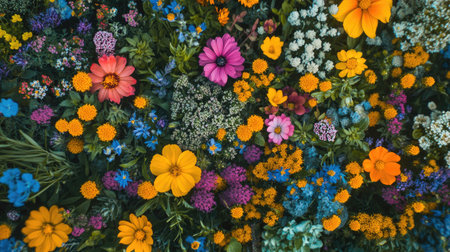 A vibrant and colorful display of various blooming wildflowers in a garden.