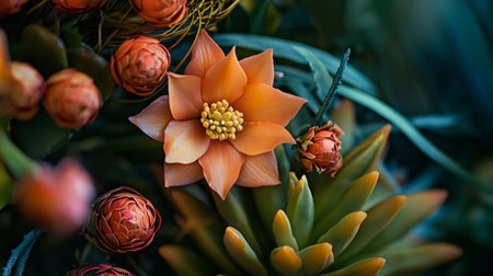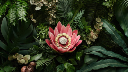 An artistic top view of a floral arrangement with exotic flowers and greenery.