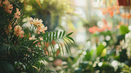 Defocused view of an indoor floral extravaganza showcasing a hazy blend of flora and fauna