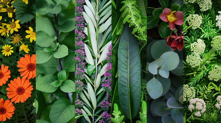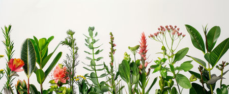 Assorted collection of green plants and flowers arranged vertically against a white background