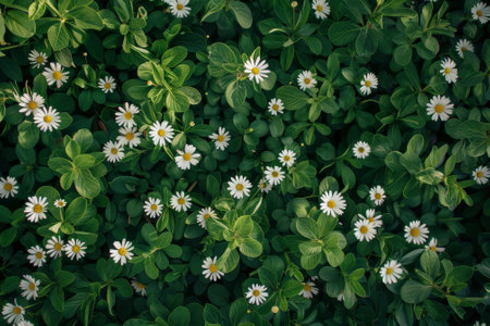An aerial photo of a field of daisies. The white flowers stand out against the green leaves.