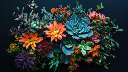 This stunning arrangement features a variety of succulents and vibrant flowers against a dark background, perfect for artistic and design purposes.
