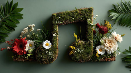 This stunning image features a moss-covered music note adorned with vibrant flowers, showcasing creativity and a blend of nature and art.