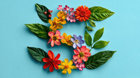 A stunning collection of vibrant flowers surrounded by green leaves, set against a soft blue background, perfect for seasonal decor or artistic projects that celebrate nature's beauty.