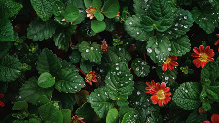 Delicate pink flowers emerge from vibrant green leaves, glistening with raindrops in a tranquil garden. The soft lighting adds a peaceful ambiance, highlighting the beauty and freshness of nature in this intimate scene.