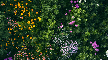 Colorful flowers in a flowerbed, top view. Floral background