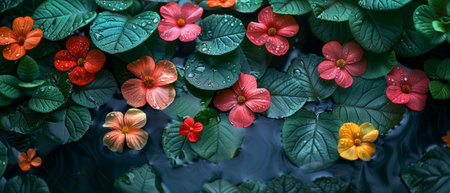 Discover a captivating display of various flowers and leaves beautifully arranged on a dark background, epitomizing the rich beauty of nature and creative inspiration.