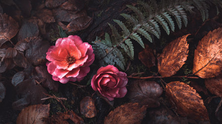 Close-up view of two pink roses amidst a bed of autumn leaves and ferns. The image showcases the intricate details of the flowers and foliage, highlighted by rich colors and deep shadows. The overall impression is one of serene beauty and natural textures.