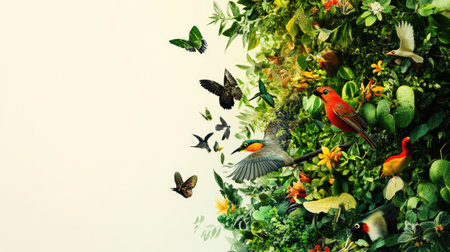 A thriving ecosystem with wildlife and plants, showcasing the beauty of nature and the need for sustainable practices in our everyday lives. Space for text or slogans.
