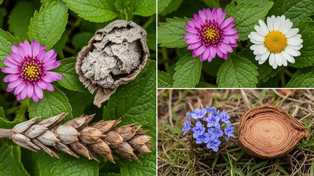 A collage of four close-up images showcasing natural textures and floral elements including purple and white flowers, a dried seed pod, and a plant stem.