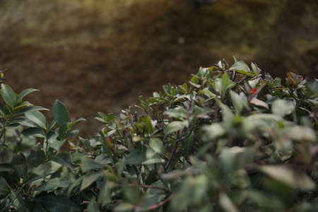 Close up shot of a bush with green leaves and blurred background.