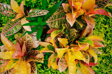 A flowerbed with green plants in the spring garden. A tropical plant. Plant foliage close-up.