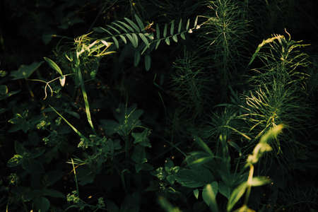 A selective focus shot of green plants in the forest under the sunlight