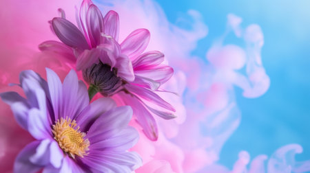 This stunning close-up showcases vibrant purple and pink flowers surrounded by a soft blue atmosphere, enhanced by a colorful smoky effect. Perfect for nature lovers.