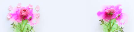 Creative image of Buttercup flower on artistic ink background. Top view with copy space