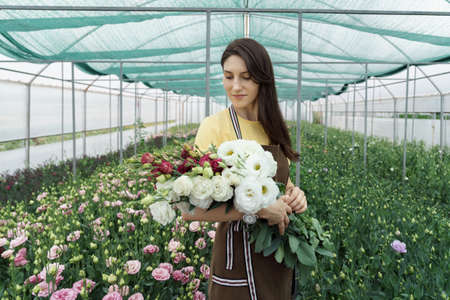 Woman florist has an order for fresh flowers. She makes a beautiful bouquet in the green house.