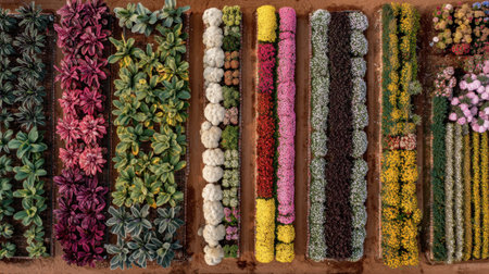 Aerial view of vibrant flower rows interspersed with green plants in a serene garden. The colorful blooms create a striking pattern against the earthy soil.