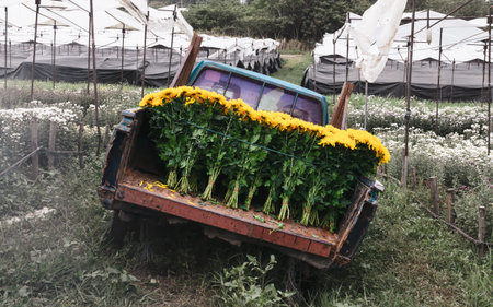 Harvest chrysanthemum flower on agriculture farmland for spring crop and transport by old truck