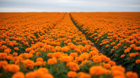 A stunning view of vibrant orange marigold flowers blooming in organized rows. This scenic field captures the beauty of nature in full bloom.