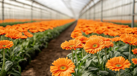 The bright interior of a Dutch greenhouse filled with rows of blooming orange Gerbera flowers, destined for transport.