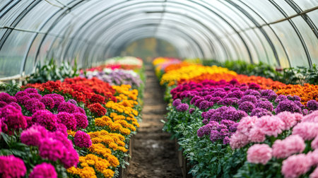 The beauty of greenhouse floriculture captured in rows of colorful flowers, blooming under perfect lighting and temperature conditions.