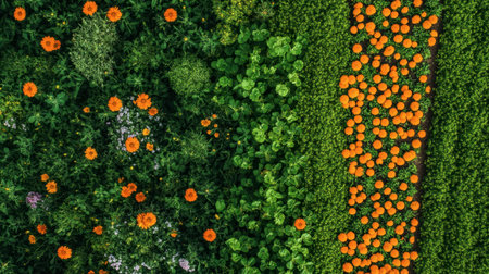 An aerial perspective showcasing vibrant marigold flowers blooming amidst lush green vegetables. This image captures the essence of organic farming and seasonal beauty.