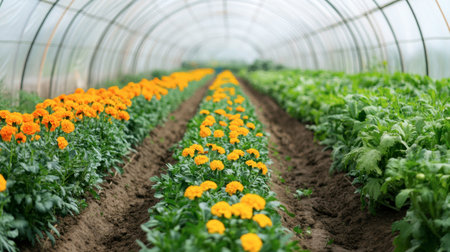 Explore a vibrant scene of marigold flowers blooming in a greenhouse, showcasing rows of bright yellow petals against rich green foliage, perfect for agriculture themes.
