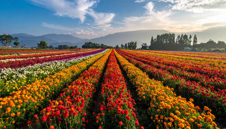 Captivating landscape featuring vibrant rows of colorful flowers in a field. This scenic view showcases nature's beauty and rich colors, perfect for a peaceful atmosphere.