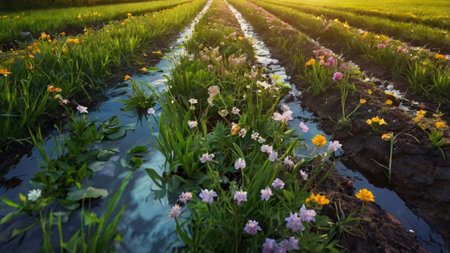 A picturesque scene showcasing vibrant yellow flowers in a freshly tilled field, surrounded by lush greenery, capturing the essence of nature's beauty and tranquility.