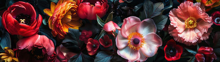 Beautiful vibrant and colorful flowers on a dramatic black background, captured from a topdown perspective