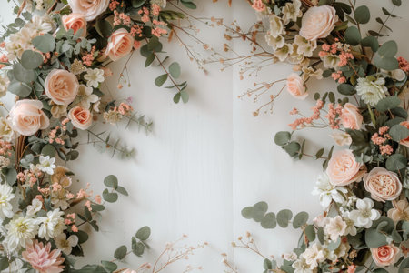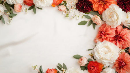 Fresh flowers and lush greenery create a beautiful arrangement along the edges of a neutral background, perfect for events or artistic displays.