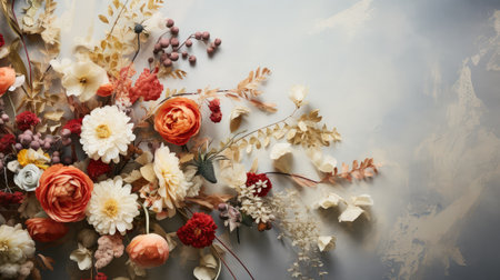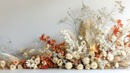 A banner featuring a collection of dried flowers arranged in a geometric, modern pattern, with bright, vibrant colors that add energy and excitement. Generative AI