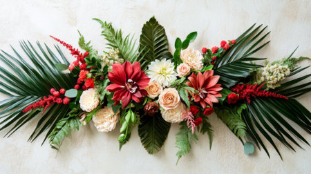 A flat lay of a decorative floral arrangement with exotic blooms and greenery, arranged on a light background, emphasizing color contrast and elegance.