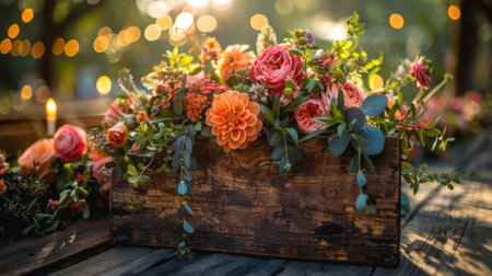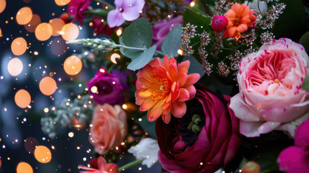 This captivating floral arrangement features a stunning mix of colorful flowers, enhanced by soft bokeh lights. Perfect for artistic or seasonal themes.