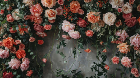 Luxurious floral arch composed of roses, peonies, and greenery set against a rustic textured wall. the sophisticated arrangement provides a perfect backdrop for high-end fashion shoots, the elegance and beauty of natural blooms.