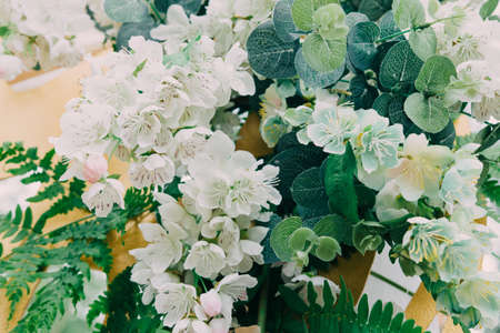 A variety of artificial fake flowers background, many bright colors, blooming, beautifully decorated, sold in one of the stores in the Thai rural market.