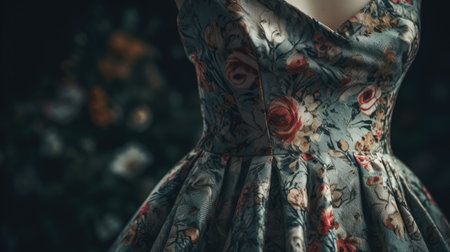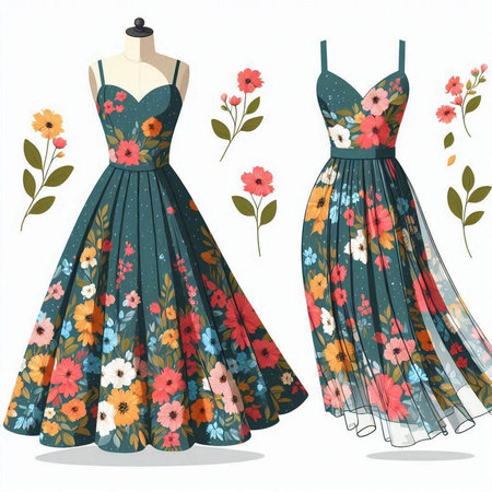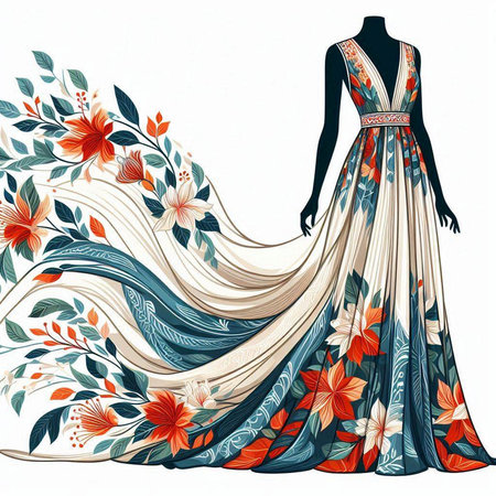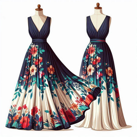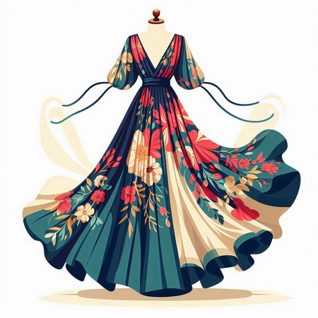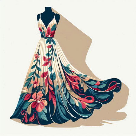Illustration of a beautiful dress with floral pattern on a mannequin