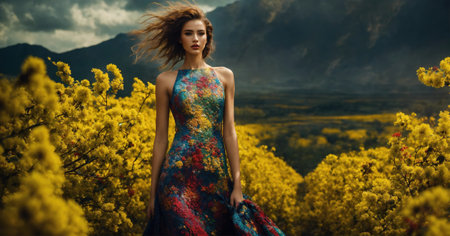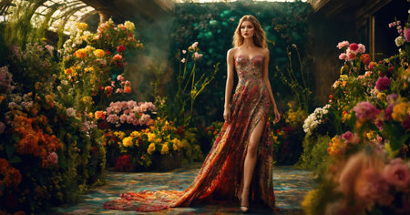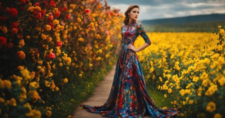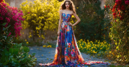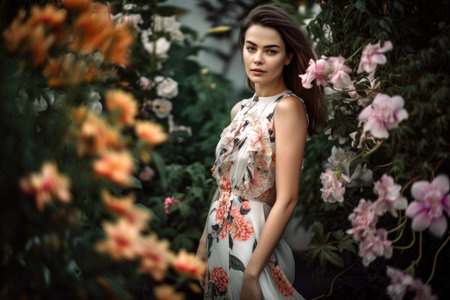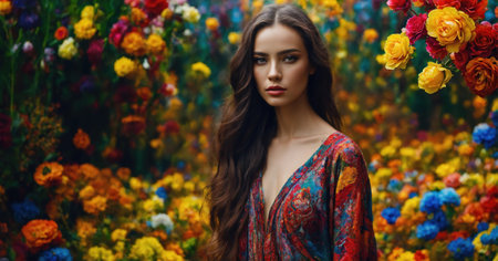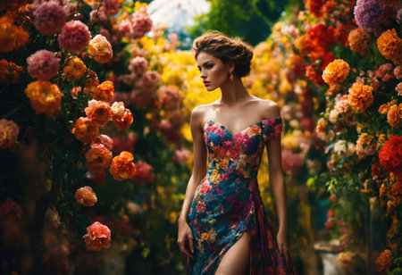 Elegant woman in a blooming garden surrounded by vibrant flowers, with a confident gaze and a flowing dress