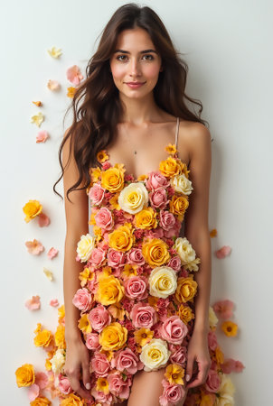 A model poses gracefully in a dress adorned with blooming pink and yellow roses. The soft floral arrangement contrasts beautifully with the plain white wall and scattered petals on the floor.
