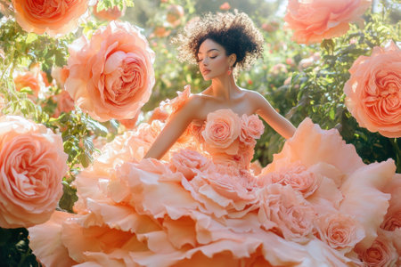 Fashion model wearing dress made of roses in garden setting