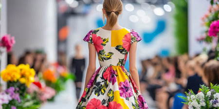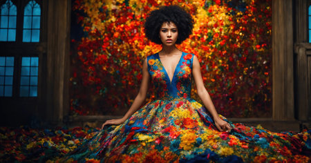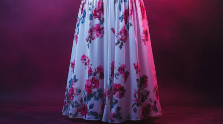 A stunning floral dress billows gently against a softly lit, colorful background. The image exudes elegance and creativity, perfect for fashion and art themes.